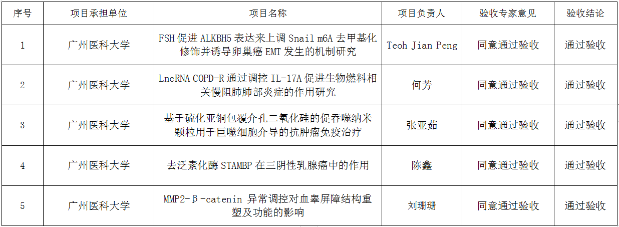 根据《广州市科技计划项目管理办法》《广州市科技计划项目经费管理办法》《广州市科技计划项目全过程简政放权改革工作方案》及学校相关规定,现对“FSH促进ALKBH5表达来上调Snail m6A去甲基化修饰并诱导卵巢癌EMT发生的机制研究”等5项广州市科技计划基础与应用基础研究项目验收结果予以公示(见附表),公示时间为2024年5月 20日至5月 22 日(3个工作日)。