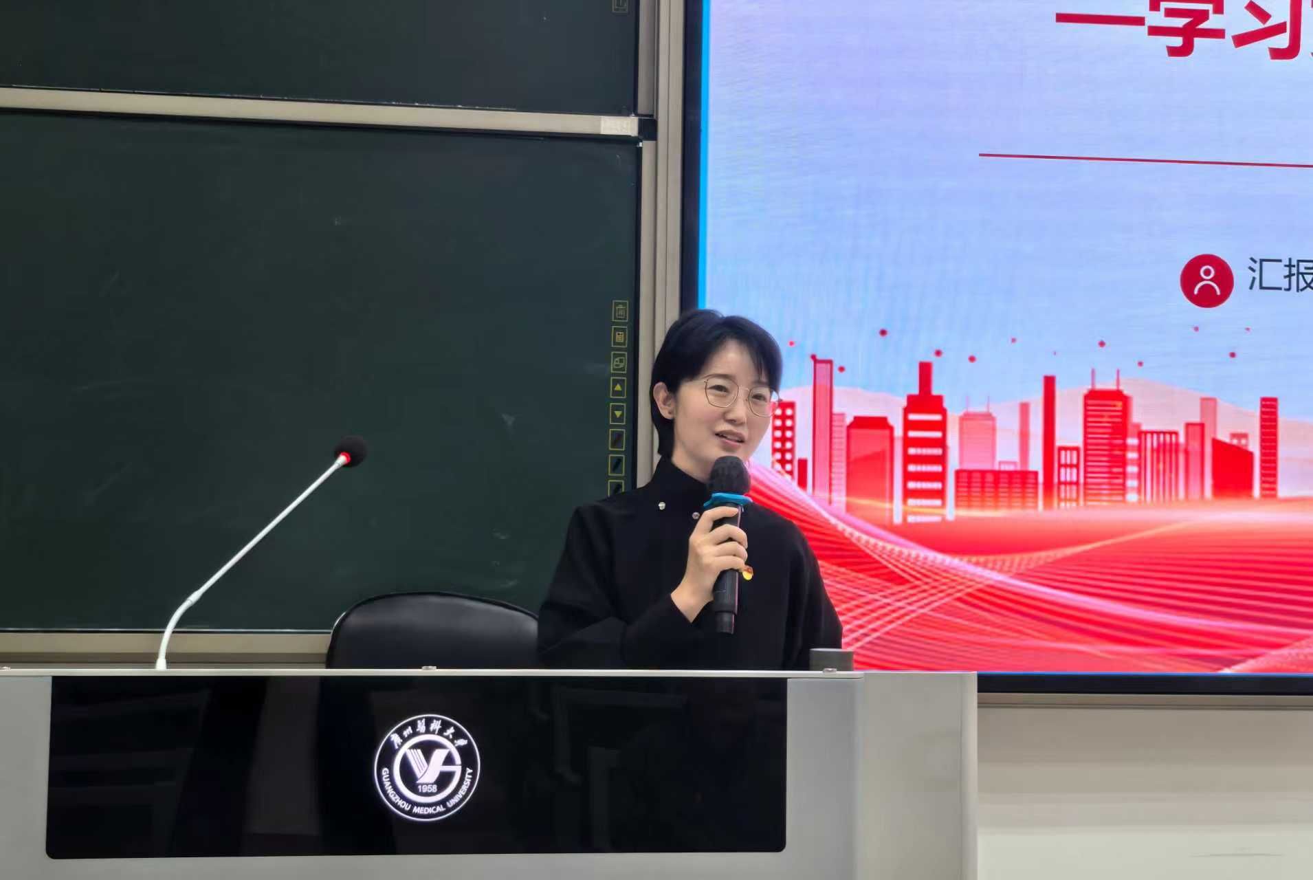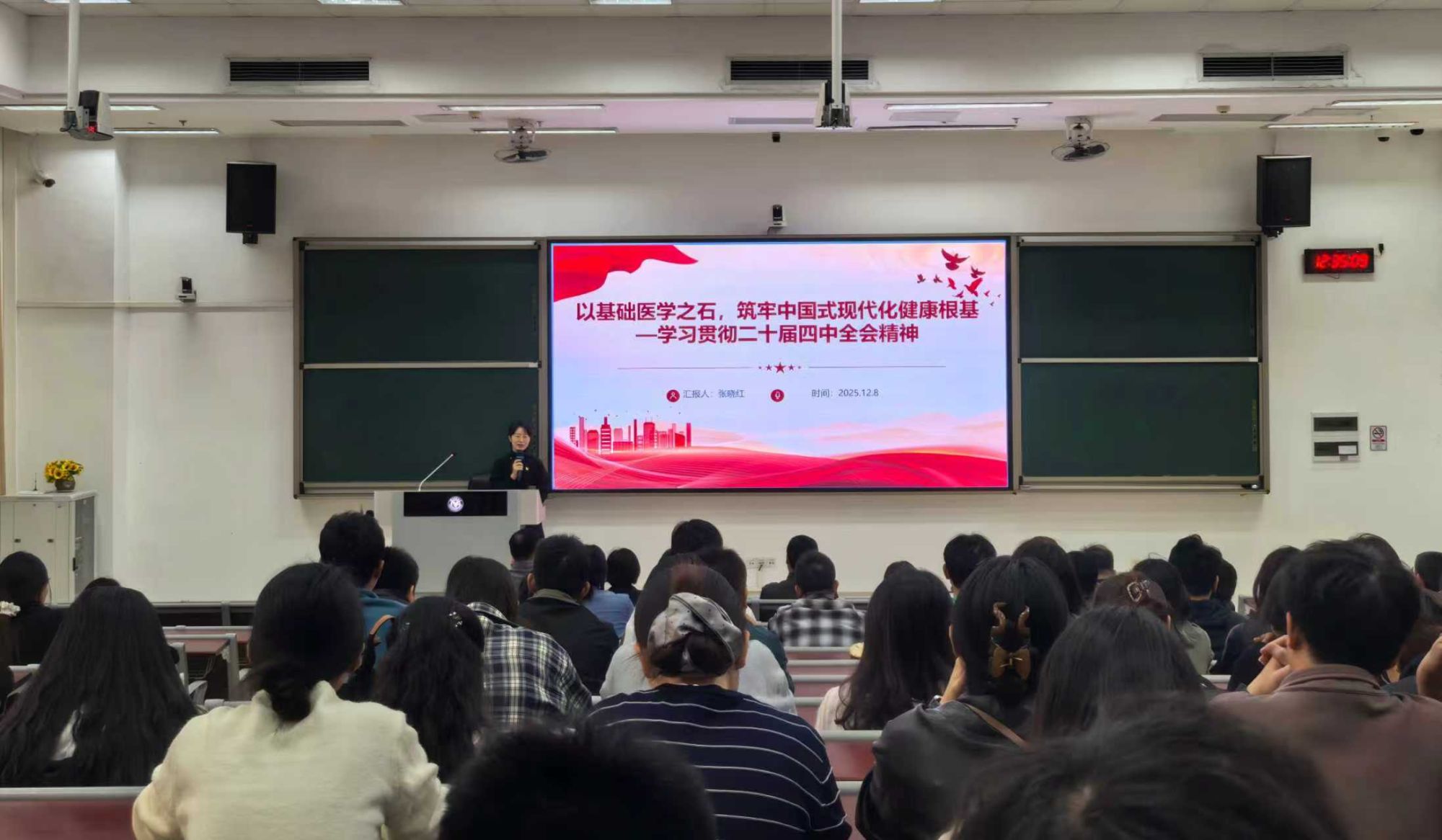 报告会上,张晓红副教授以“以基础医学之石,筑牢中国式现代化健康根基”为题,围绕习近平总书记在党的二十届四中全会上的重要讲话和《中共中央关于制定国民经济和社会发展第十五个五年规划的建议》,对党的二十届四中全会精神进行了全面系统的解读,同时紧密结合基础医学学科特色展开针对性阐释。张老师的报告站位高远、贴合实际,既系统解读了全会精神的核心要义,又精准锚定了基础医学的学科定位与发展方向,为与会人员明晰了基础医学服务国家战略的实践路径。