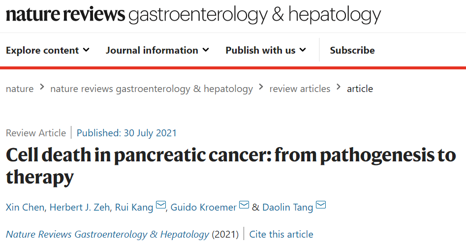 广东省高校蛋白质修饰与降解重点实验室成员陈鑫博士,以第一作者身份在Nature Reviews Gastroenterology & Hepatology(IF: 46.802)期刊发表题为 “Cell death in pancreatic cancer: from pathogenesis to therapy” 综述。该文首先介绍了调节性细胞死亡(细胞凋亡,坏死性凋亡,细胞焦亡,铁死亡和碱死亡)的关键分子机制,总结了胰腺癌细胞中七大信号通路(TP53,KRAS,TGFβ,缺氧,代谢,自噬和热休克反应) 对调节性细胞死亡的调控机制,并概括了调节性细胞死亡在胰腺癌发生发展中的双向调节(促肿瘤或抑肿瘤)作用,最后讨论了调节性细胞死亡在胰腺癌治疗(化疗,放疗,免疫治疗等)中的作用。总体上,该综述描述了胰腺癌细胞中致死信号的复杂性和多面性,强调了激活细胞死亡途径实现胰腺癌的精准治疗的挑战和机遇。