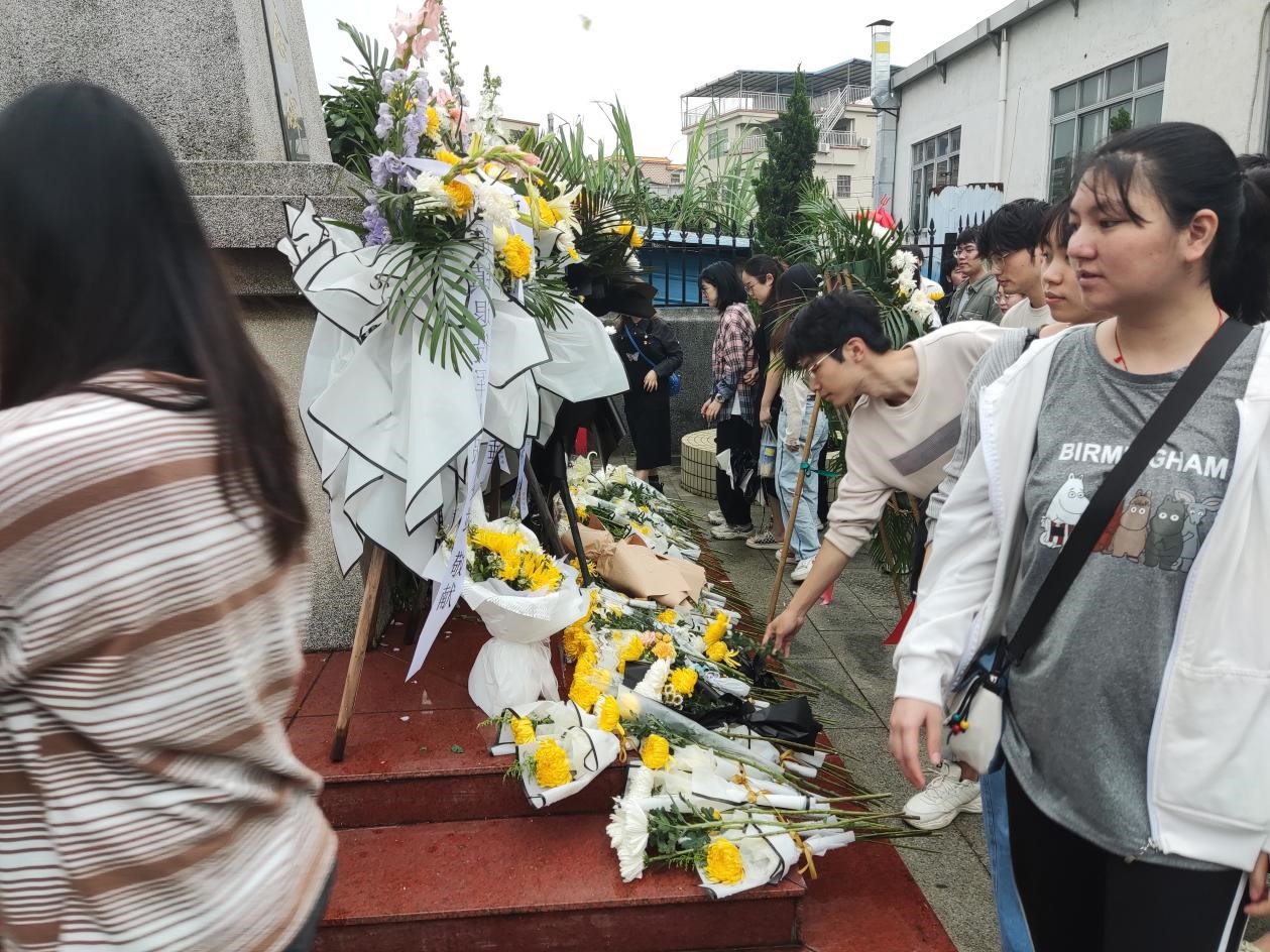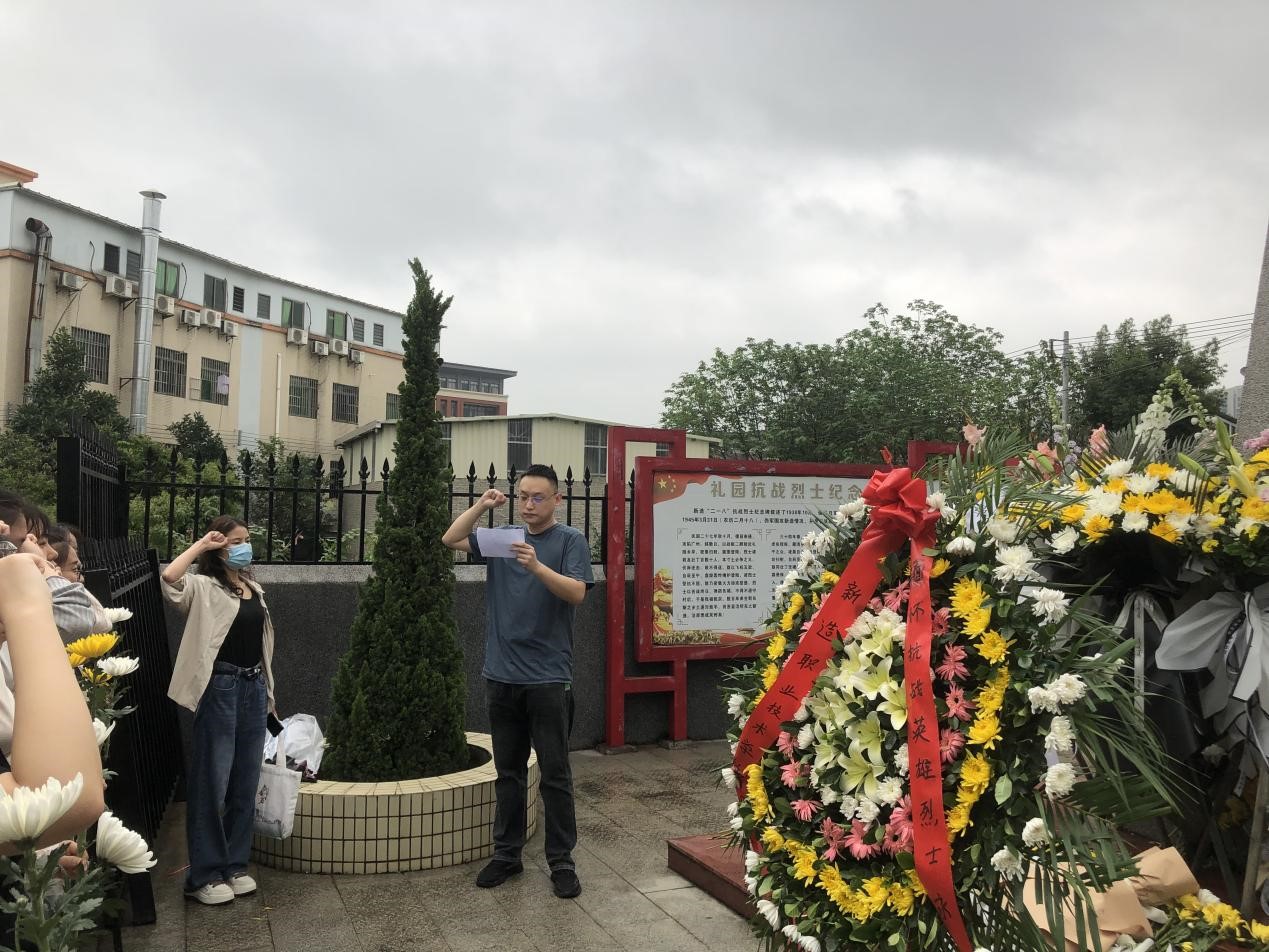 新造“二一八”抗战烈士纪念碑位于广州市番禺区新造镇秀发村的公路旁。纪念碑是为纪念1945年3月31日(农历二月十八),新造八坊人民抗日自卫大队抗击伪军“大扫荡”及在反“扫荡”中牺牲的革命烈士而建。在庄严肃穆的墓碑前,张尚带领全体党员重温入党誓词,字字铿锵,句句铭心。刘倩倩带领全体同学向革命烈士鞠躬、敬献鲜花。祭奠活动结束后,同学们依次有序环绕纪念碑,追忆先烈。