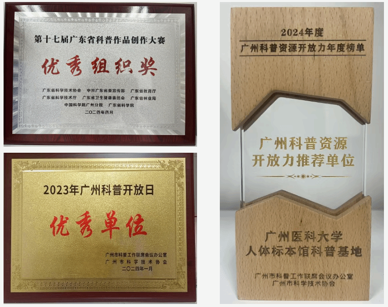 、实验、科普教育为一体的,揭示生命活动与人体健康的生命科学馆。科普总展示面积约为960平方米,场馆每次可接待参观人数120人,每年可接待5000人以上。人体标本馆在2019年被评为“广州市第十二批科普基地”;在2023年被评为“广州科普开放日优秀单位”;在2024年被评为“广东省科普教育基地”和“广州科普资源开放力推荐单位”。