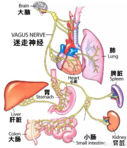 迷走神经在颈部、胸部、腹部均发出多个分支,支配颈部、胸腔内器官及腹腔内大部分脏器,通过传导器官和脏器的感觉冲动及控制心肌、平滑肌和腺体活动来调节循环、呼吸、消化三个系统。