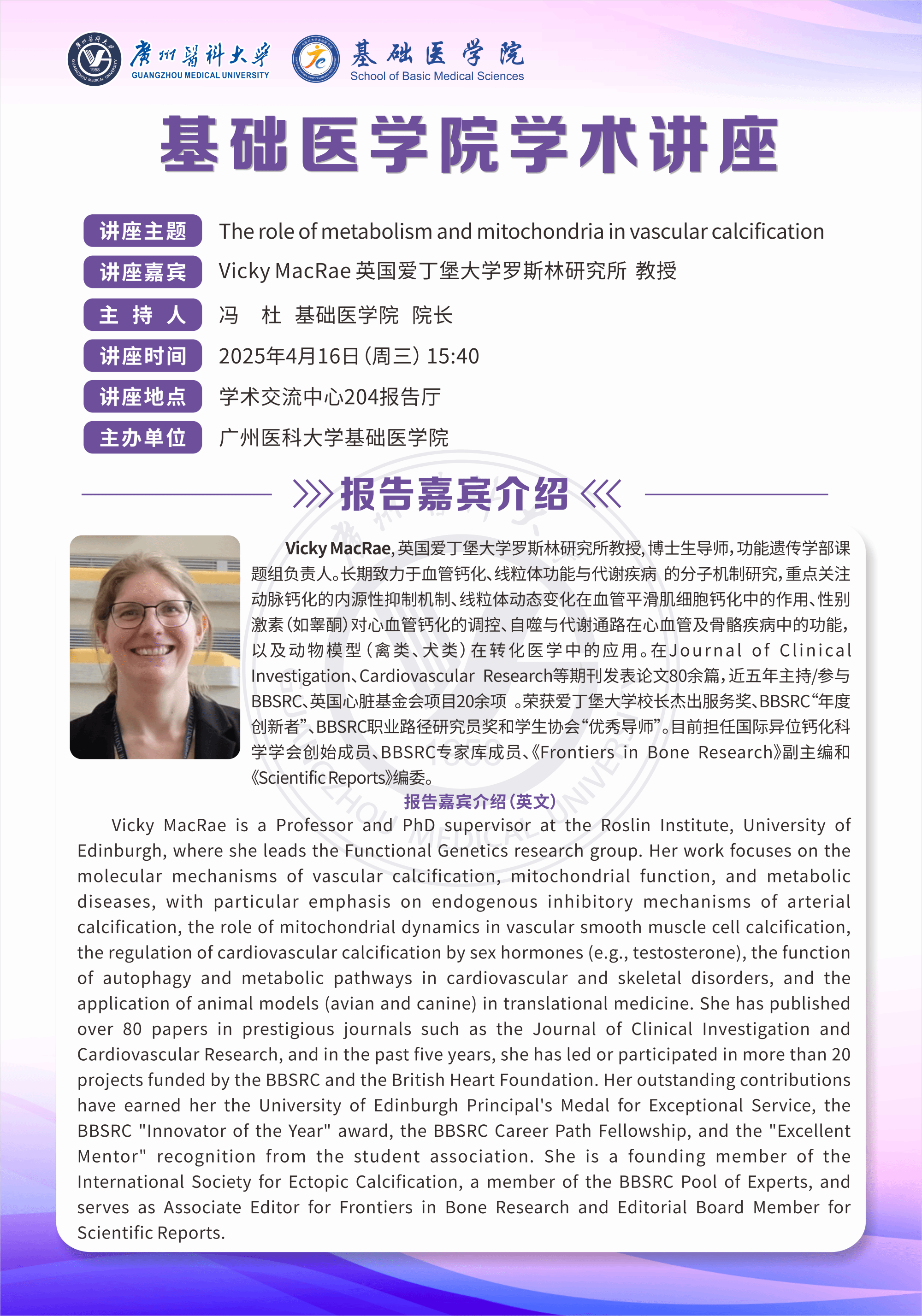 Vicky MacRae 教授是我校客座教授,本次讲座也是2025年度基础医学专业国际课程周的线下课程第二讲,欢迎各位老师和同学前来参加!